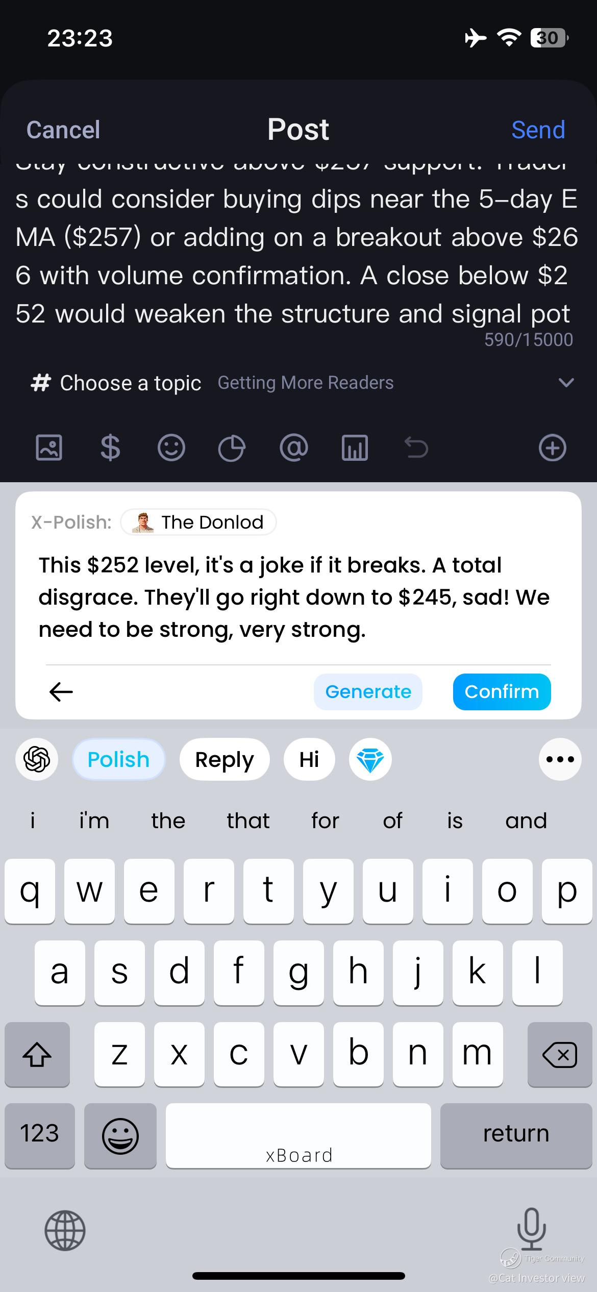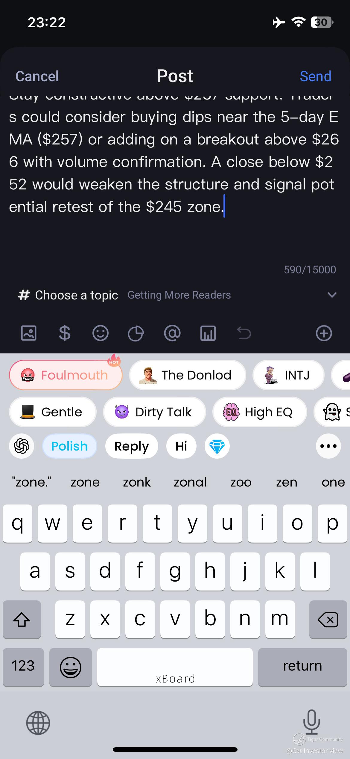 Stay constructive above $257 support. Traders could consider buying dips near the 5-day EMA ($257) or adding on a breakout above $266 with volume confirmation. A close below $252 would weaken the structure and signal potential retest of the $245 zone.
