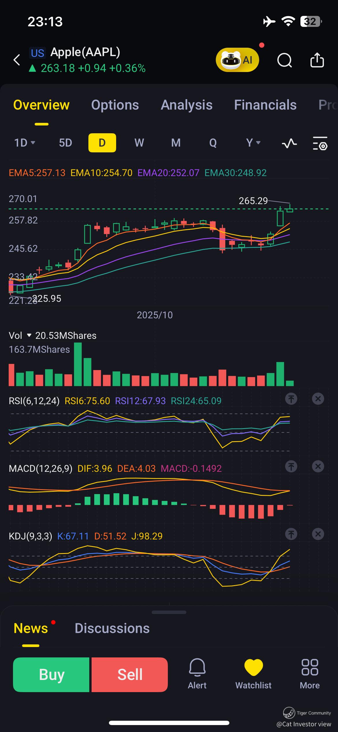 $Apple(AAPL)$ Apple’s short-term trend has turned constructive again. After a brief correction earlier this month, the stock rebounded sharply, reclaiming all major EMAs (5, 10, 20, 30), which are now showing a synchronized upward alignment — a typical early-stage bullish setup.
