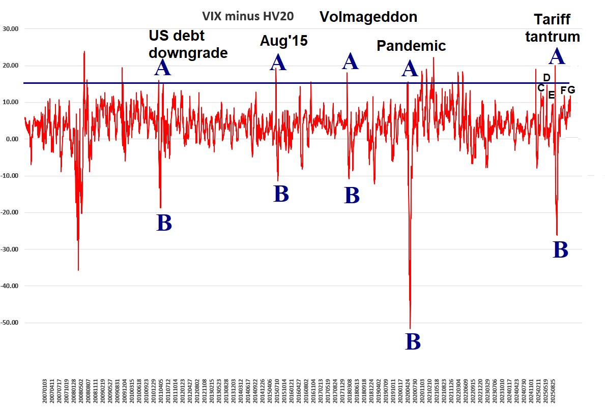 A recent topic that we’ve discussed and based a few trades on is the differential between realized (HV20) and implied volatility ($VIX). First, we published an article back in May describing how the market normally rallies after VIX minus HV20 was –10 (minus 10) or less. That produced a strong buy signal in May...