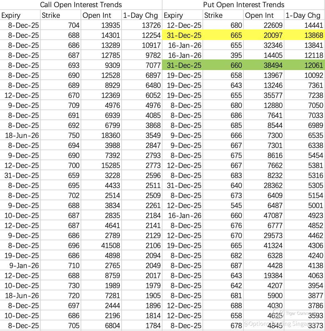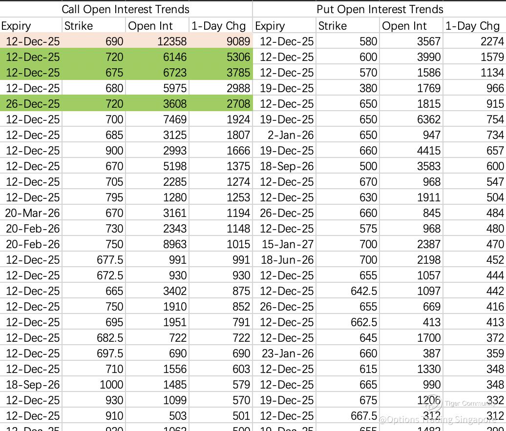 Most call selling is concentrated above 700, including the 720C $META 20251212 720.0 CALL$ . The weekly 690C shows mixed long/short activity.