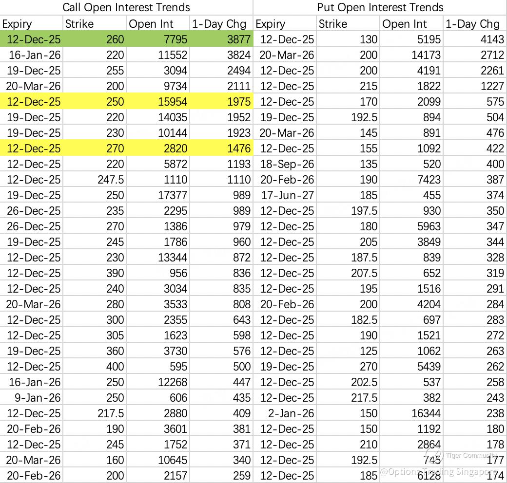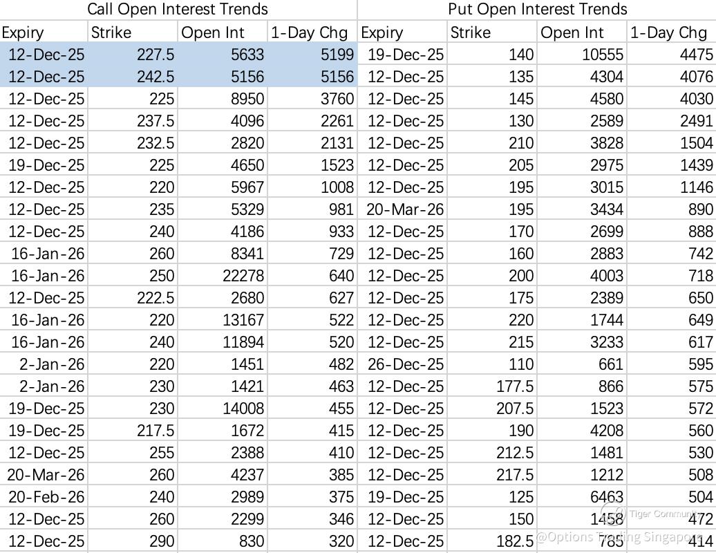 Another muted week is expected. Institutions opened a call spread — selling the 227.5C $AMD 20251212 227.5 CALL$  and buying the 242.5C $AMD 20251212 242.5 CALL$ . The short call strike is slightly above last week’s 222.5C.