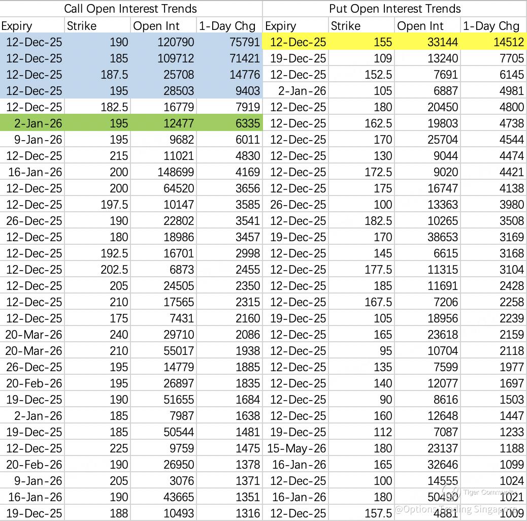This week’s institutional call selling is centered on the 187.5C $NVDA 20251212 187.5 CALL$ , hedged with the 195C $NVDA 20251212 195.0 CALL$  — similar strikes to last week, reinforcing limited upside expectations. Selling calls on strength continues to make sense.