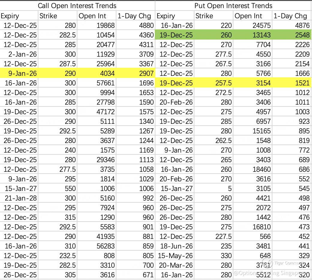 Expected weekly range: $270–292.5. There is sporadic opening of various 300C positions across expiries, but hitting 300 this week is highly unlikely.