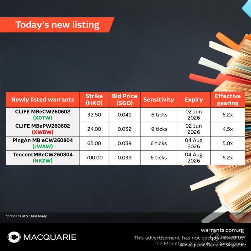 ✳ China Life call $CLIFE MBeCW260602(X0TW.SI)$ : https://warrants.com.sg/tools/livematrix/X0TW