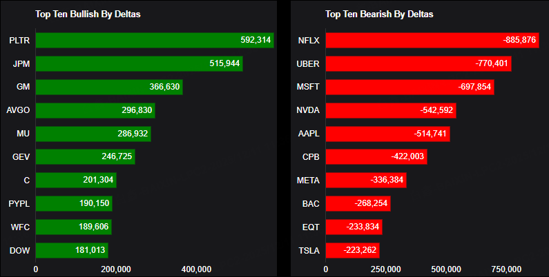 Based on option delta volume, traders sold a net equivalent of -885,876 shares of $Netflix(NFLX)$ stock. The largest bearish delta came from selling calls. The largest delta volume came from the 26-Dec-25 95 Put, with traders getting long 126,184 deltas on the single option contract.
