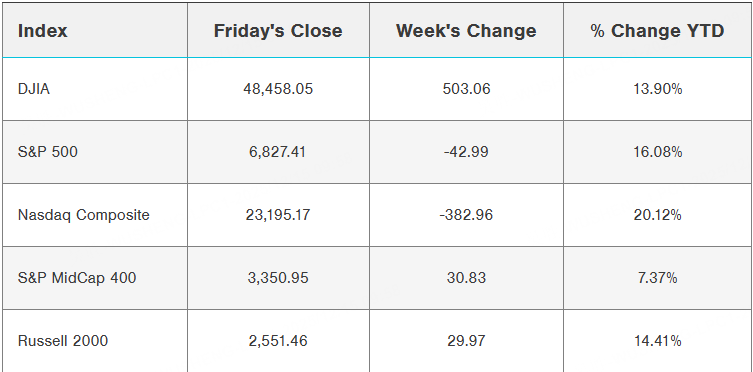 Most major stock indexes rose and hit all-time highs during the week, supported by the Federal Reserve’s third consecutive interest rate cut and commentary from central bank officials that some investors interpreted as less hawkish than feared. The small-cap Russell 2000 Index, which can be more sensitive to interest rate moves than its large-cap peers, performed best, adding 1.19%, followed by the Dow Jones Industrial Average’s 1.05% gain. The S&P MidCap 400 Index rose to a lesser degree, while the S&P 500 Index pulled back sharply on Friday and erased its gains from earlier in the week.