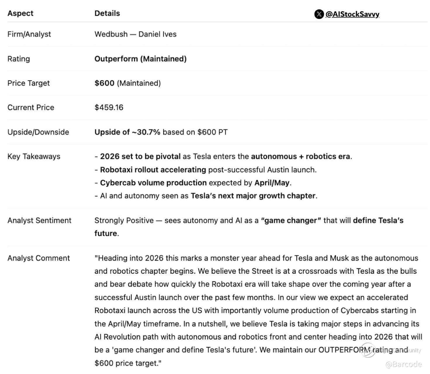 Street validation is beginning to converge with what the chart and the data are already signalling. Wedbush’s Daniel Ives reiterated an Outperform rating on $TSLA and maintained his $600 price target, explicitly framing 2026 as a defining year as Tesla enters the autonomous and robotics era. Wedbush highlighted accelerating Robotaxi rollout following the successful Austin deployment, alongside expectations for Cybercab volume production beginning around April to May. Importantly, the note makes clear that vehicle deliveries are becoming less central to the thesis, with AI, autonomy, and robotics now viewed as Tesla’s next major growth chapter and a structural re-rating driver.