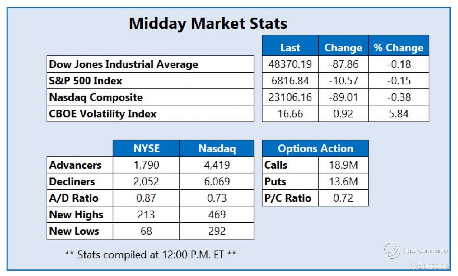 $Dow Jones(.DJI)$ $NASDAQ(.IXIC)$ $S&P 500(.SPX)$ Midday Market Check: Stocks gave back early gains midday as tech weakness lingers. $DJI & $IXIC turned red, with Nasdaq eyeing a THIRD-straight loss, while $SPX hovering near flat. AI/data-center valuations remain a drag & $BTC slipping to $85K range again.