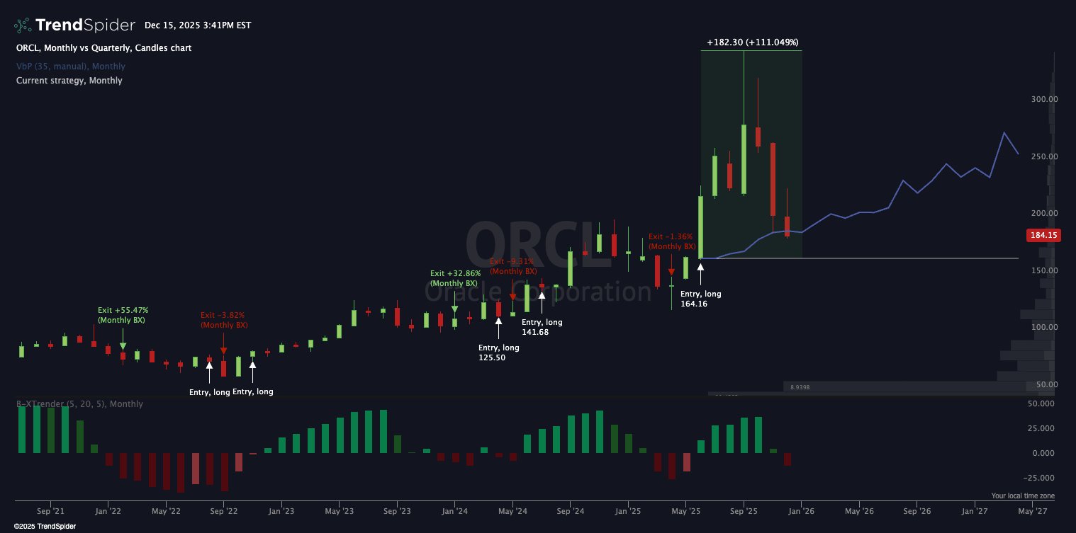 Our bull‑cycle strategy went long in June and $ORCL ran ~100%. The model had us around $180 by Dec 2025, so even after this drop we’re basically right on schedule.