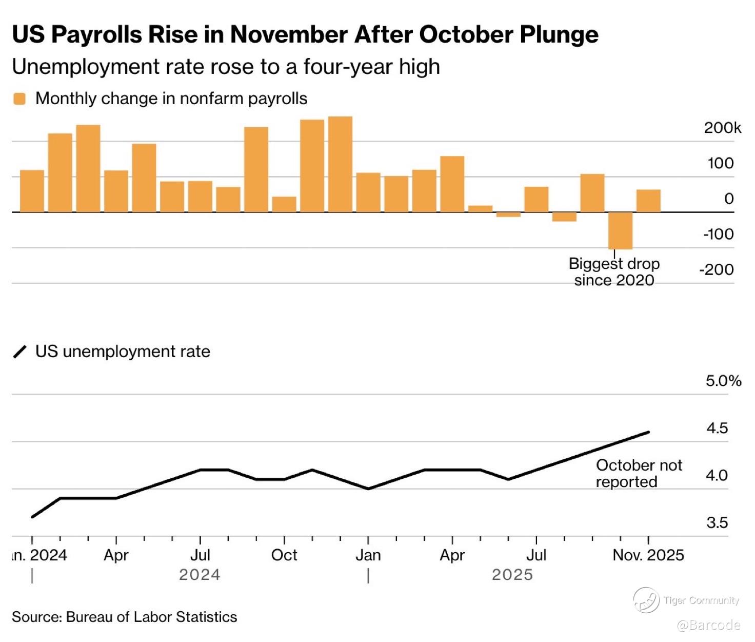 The delayed November jobs report beat headline estimates, but the internals are softer. November added 64,000 jobs versus 40,000 expected, after a major October revision showing 105,000 jobs lost. Unemployment jumped from 4.4% to 4.6%, above the 4.5% estimate and the highest level in more than four years.