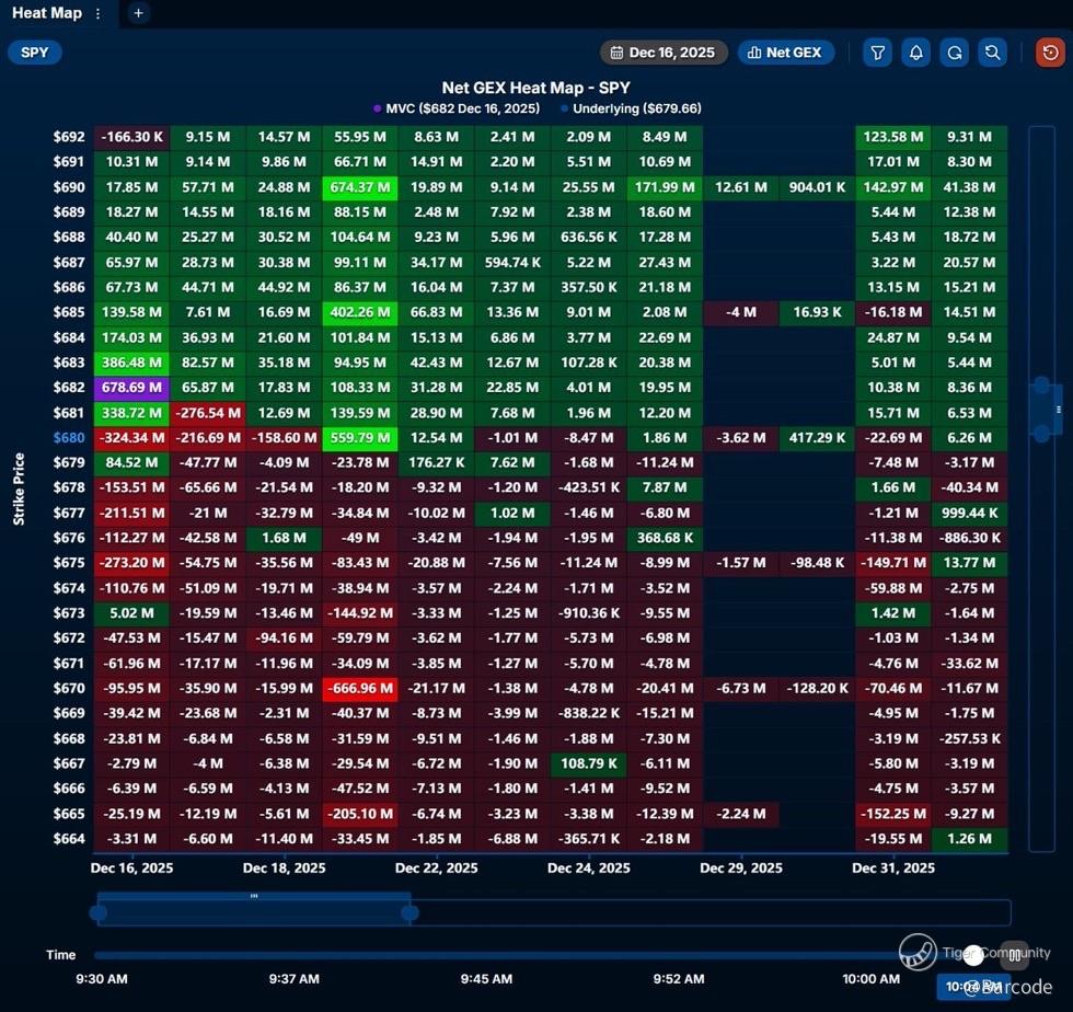 Positive gamma is stacked tightly between $681–$685, with the MVC anchored at $682. That zone is acting as a magnet, repeatedly pulling price back into balance. Below spot, negative gamma builds aggressively from $670–$675, creating a sharp asymmetry if support fractures.