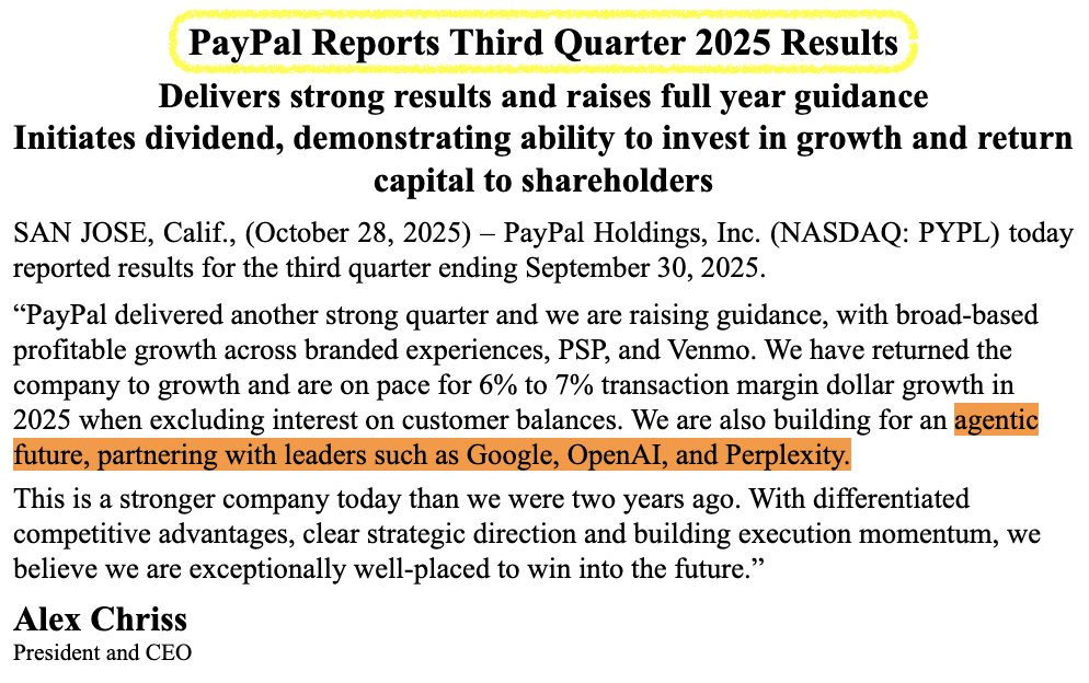 In the official Q3 results letter, PYPL said it was building for the "agentic future, partnering with leaders such as Google, OpenAI, and Perplexity."