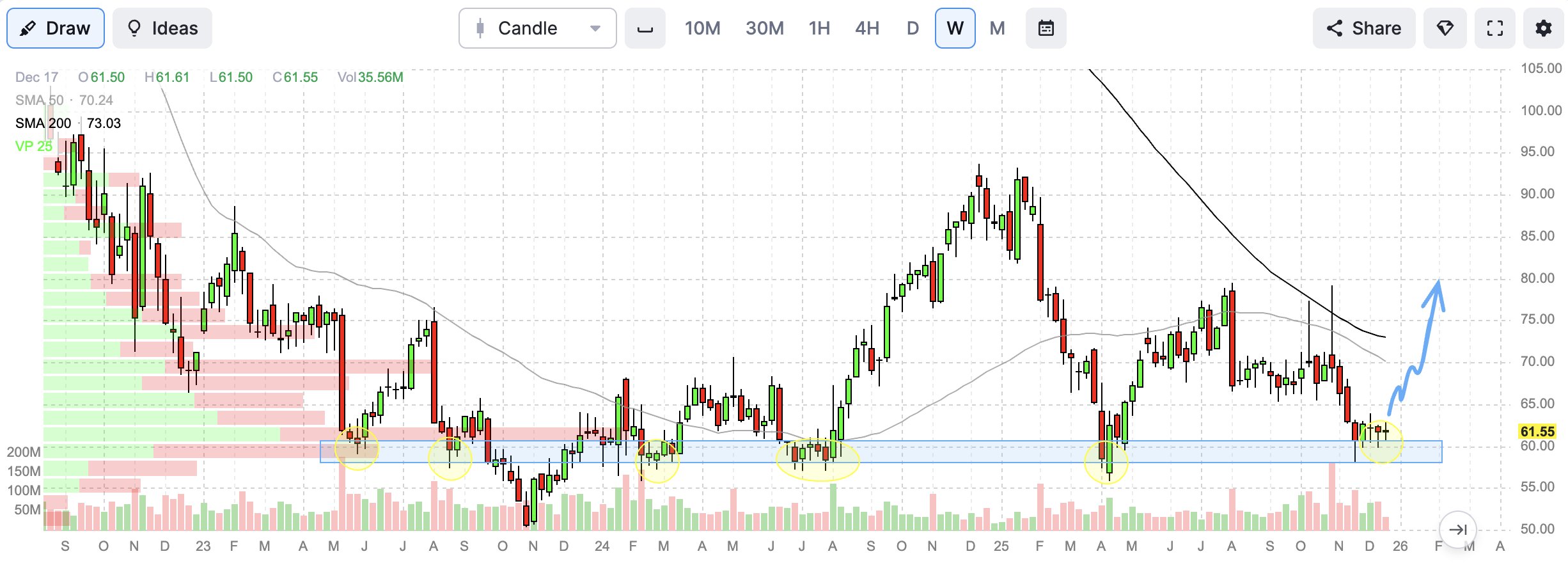 I have the weekly chart attached here, and $60 is my risk level. If a daily candle closes under $60, I'm out.