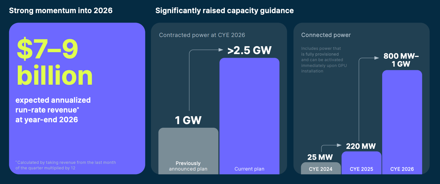 After presenting Q3 2025 earnings, Nebius announced ambitious new plans. Increasing their contracted power target to 2.5GW and connected power target to 0.8-1GW. This would directly translate into higher revenues, thus the company increased the 2026 ARR target to $7-9B.