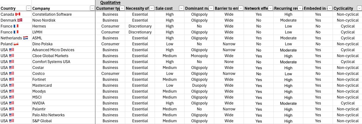 $Constellation Software, Inc.(CNSWY)$ $Novo-Nordisk A/S(NVO)$ $Hermes International SA(HESAF)$ $LVMH-Moet Hennessy Louis Vuitton(LVMHF)$ $ASML Holding NV(ASML)$ $Advanced Micro Devices(AMD)$ $Cboe Volatility Index(VIX)$ $Comfort Systems USA(FIX)$ $Costar Technologies, Inc.(CSTI)$ $Costco(COST)$ $Fortinet(FTNT)$ $MasterCard(MA)$ $Moody's(MCO)$ $MSCI Inc(MSCI)$ $NVIDIA(NVDA)$ $Palantir Technologies Inc.(PLTR)$ $Palo Alto Networks(PANW)$ $S&P Global(SPGI)$