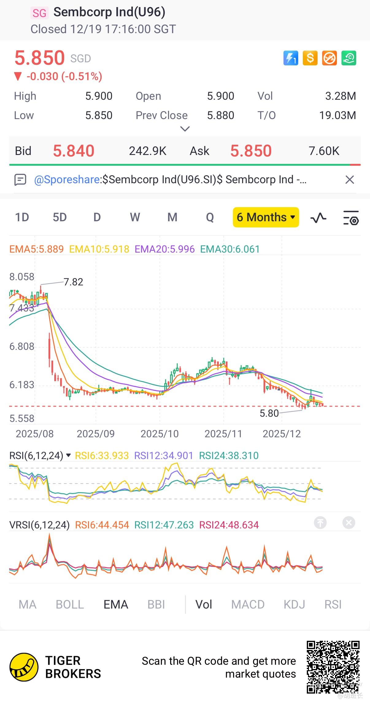 $Sembcorp Ind(U96.SI)$  near 6-month low