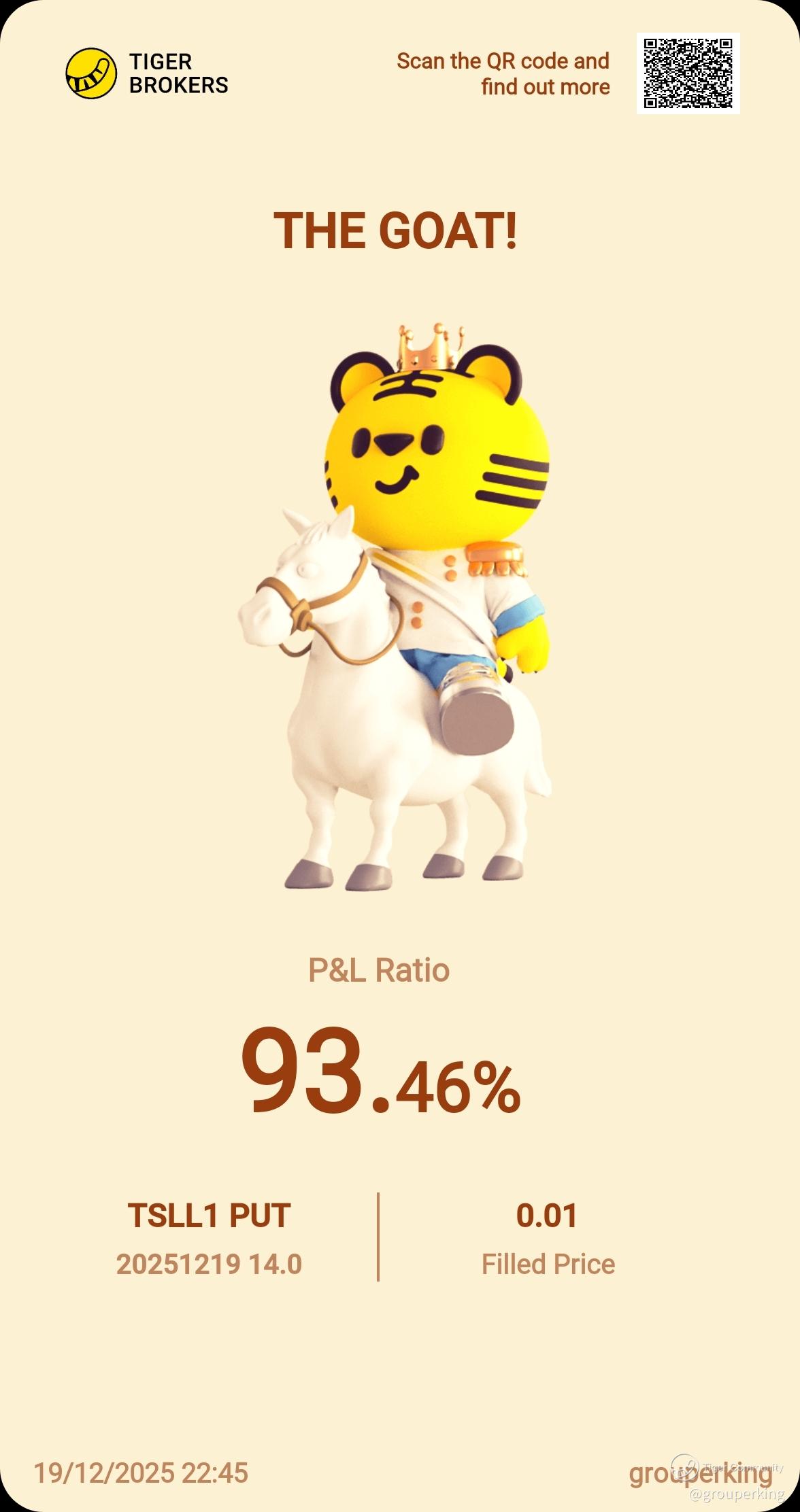 $TSLL1 20251219 14.0 PUT$ Closed position early to materialise profit. Chicken wings + Lunch money fir the Christmas week.