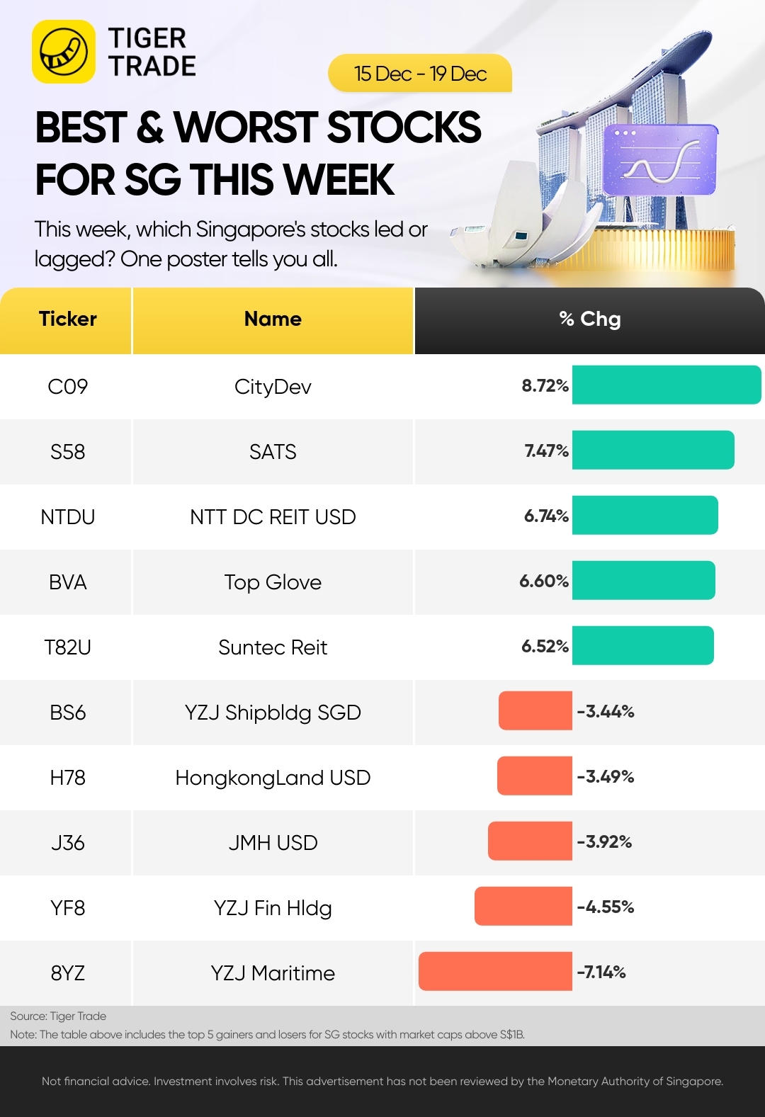 In terms of individual stocks, $CityDev(C09.SI)$ rose 8.7%; $SATS(S58.SI)$ rose over 7%; $NTT DC REIT(AIY.SI)$, $Top Glove(BVA.SI)$, $Suntec Reit(T82U.SI)$ rose over 6%; $YZJ Maritime(BYZ.SI)$ down over 7%; $YZJ Fin Hldg(YF8.SI)$, $JMH USD(J36.SI)$ down around 4%.