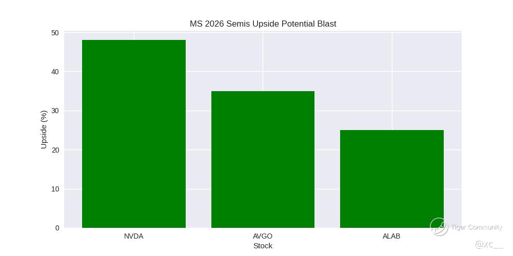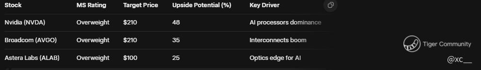 Morgan Stanley's bull call isn't hype â they argue the chip boom's just heating up, with Nvidia's processors and Broadcom's interconnects dominating data center growth, while Astera Labs' optics edge solves bandwidth bottlenecks for 4x faster AI training. The upcycle's fueled by $3T hyperscaler capex waves by 2029, turning 30% utilization lags into 50% ramps as adoption surges. For Nvidia, this means FY2026 rev exploding to $200B+ if H200 shipments to China ramp 20% post-Trump approval â a far cry from November's 5% slide. Broadcom's Q4 $18B beat with AI chips doubling to $6.5B adds nitro, projecting triple-digit growth that counters margin misses. Astera Labs, the dark horse, shines with custom silicon for AI infra, eyeing 25% rev pops if deals with Meta scale. This trio's set to crush as AI demand outstrips supply, making recent pullbacks a gift for dip buyers. đ