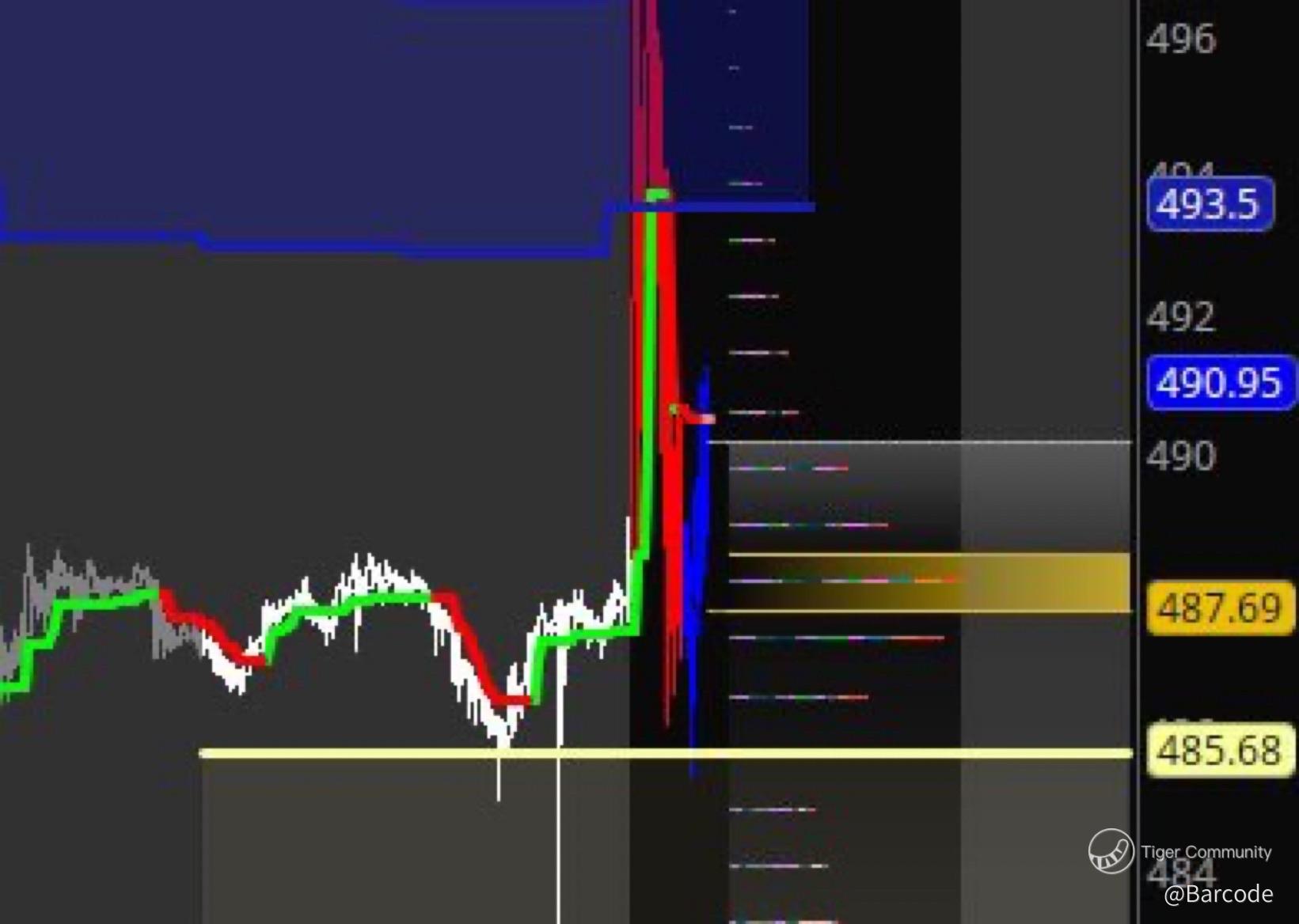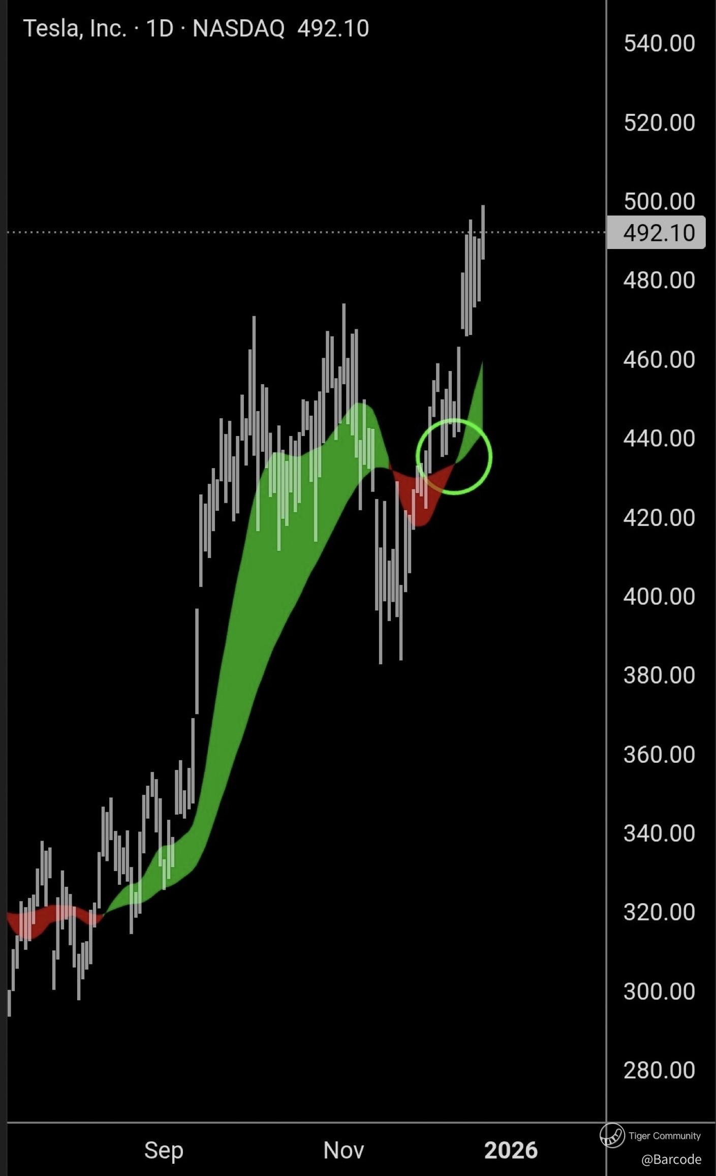 I’m watching $TSLA behave exactly how a momentum led breakout should. The stock printed a fresh all time high at $498.93, tagged my $498.8 blue band almost to the cent, and pulled back in a controlled, mechanical way. That response was not emotional selling. It was liquidity being tested and absorbed.