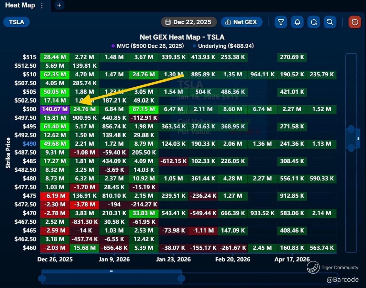 The net GEX heat map makes the setup clear. The $500 strike is the dominant MVC with roughly $140M of positive gamma into Dec 26. Gamma thins quickly below the $490s and becomes more fragmented above $500. That structure naturally creates a market that needs multiple attempts before acceptance occurs.