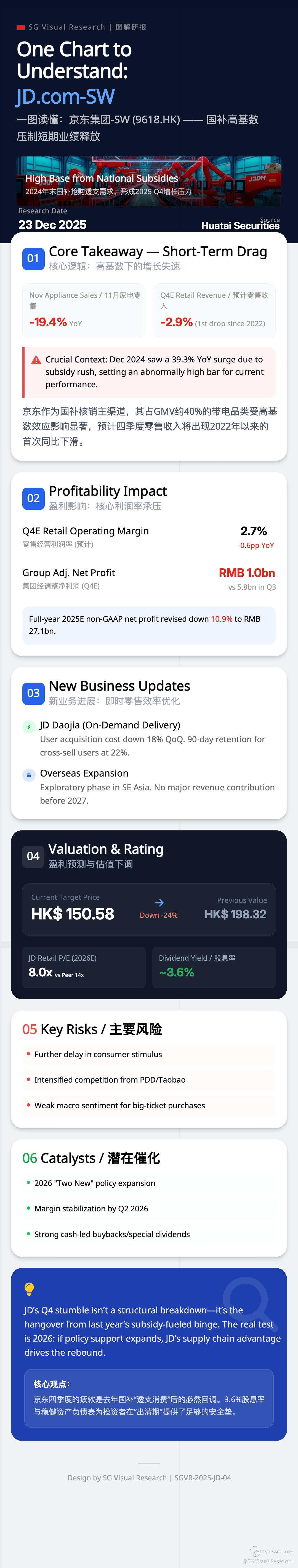 November appliance sales plunged 19.4% YoY. As the go-to platform for subsidy redemptions, JD bears the brunt. Adjusted net profit is expected to collapse to just RMB 1bn in Q4.