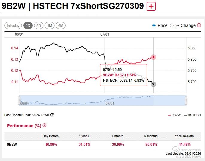 The $HSTECH(HSTECH)$ continued its strong performance to begin the year, having risen 5.08% so far year-to-date. The $HSTECH 7xLongSG270331(YPCW.SI)$ is up roughly 10% for the year, while the corresponding $HSTECH 7xShortSG270309(9B2W.SI)$ has declined by a similar magnitude.