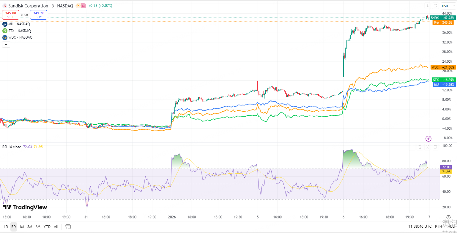 Yesterday's euphoria was fueled by $NVIDIA(NVDA)$ CES 2026 announcement and the projected 60 to 70% price hikes for memory chips in Q1. This caused investors to rush in, sending SanDisk up over 27% in a single day.