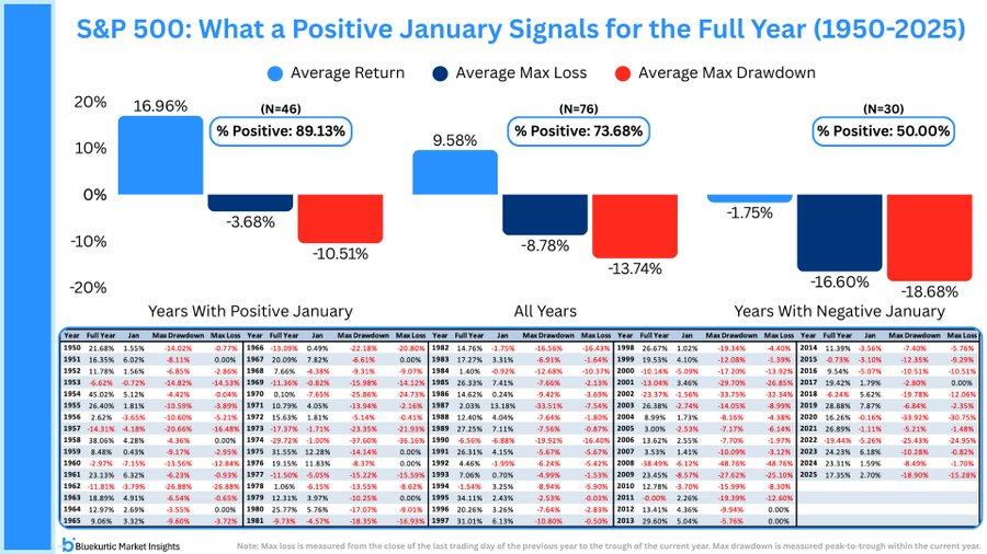 As January goes, so goes the year. When January closes positive, the S&P 500 is higher 89% of the time, with an average gain of 17% and an average maximum drawdown of 10.5%. When January is negative, average returns fall to -1.8%, with only a 50% hit rate and deeper market drawdowns.