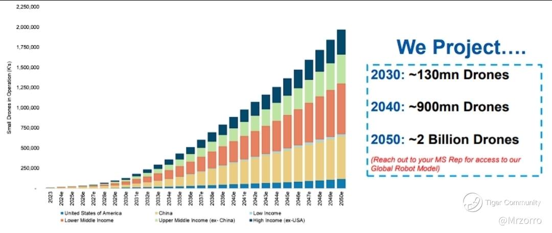 Morgan Stanley's long-range scenario work adds fuel to the narrative: it projects the global drone fleet could rise to 130 million by 2030, 900 million by 2040, and over 2 billion by 2050, driven by AI iteration, policy support, and expanding applications.