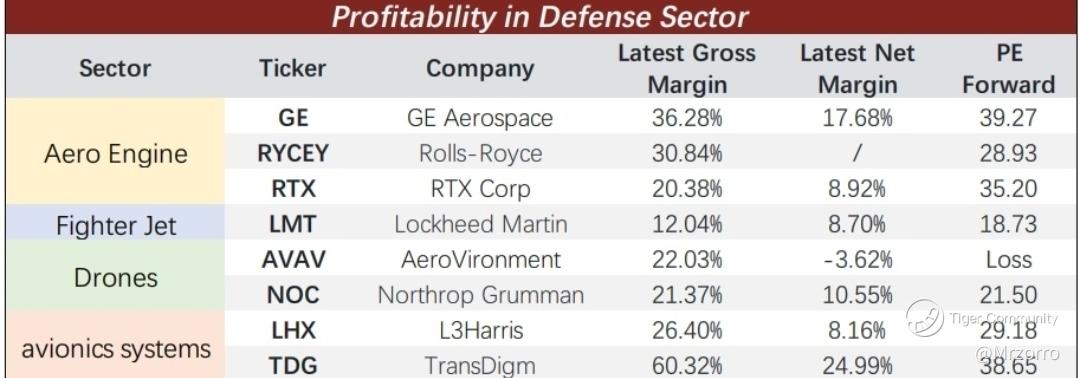 In contrast, while $Lockheed Martin (LMT.US)$ is the most renowned in the defense sector with the largest revenue, its profit margins as a prime contractor for numerous projects are not particularly high. Consequently, the market values LMT at less than 20 times PE, while engine and avionics system companies command higher valuation premiums.
