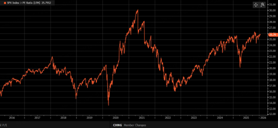 From a valuation perspective, the S&P 500's price-to-earnings ratio has surpassed 25 times, reaching a multi-year high: