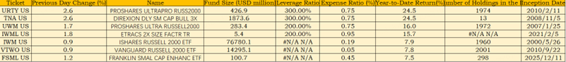 $Direxion Daily Small Cap Bull 3x Shares(TNA)$ is a leveraged ETF with assets under management of $1.9 billion. It offers decent liquidity but carries a relatively high management fee of 0.75%, making it suitable for short-term investors.