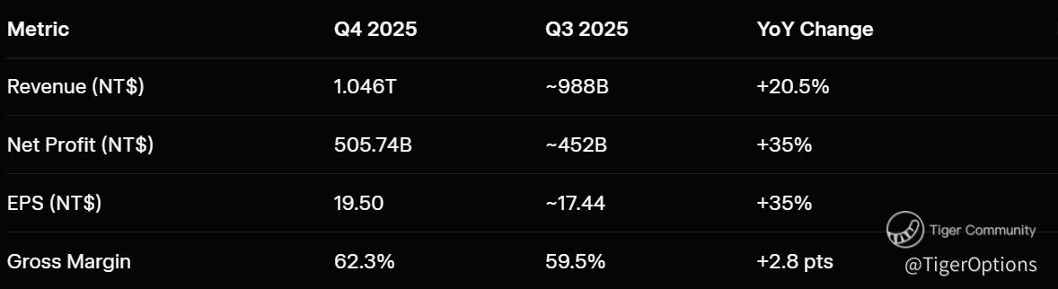 TSMC, the world's largest contract chipmaker, reported a net profit of NT$505.74 billion (approximately $16 billion) for the fourth quarter of 2025, marking a 35% year-over-year increase and beating analyst estimates of NT$478.4 billion. Revenue climbed 20.5% to NT$1.046 trillion ($33.7 billion), up 25.5% in U.S. dollar terms, driven primarily by high-performance computing (HPC) applications, including AI accelerators. Earnings per share (EPS) came in at NT$19.50 ($3.14 per ADR), reflecting the company's pivotal role in the AI ecosystem.