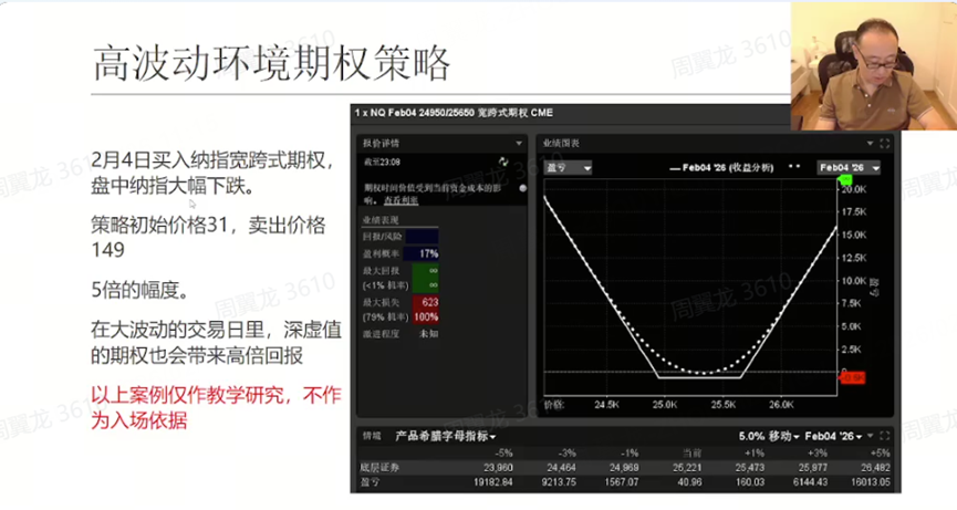 Regarding U.S. equities, the instructor used a real-time example to illustrate how to trade volatility: on February 4, as the Nasdaq approached a critical technical level, he chose not to bet on whether it would surge or plunge, but instead implemented a long straddle (buying both a put and a call).
