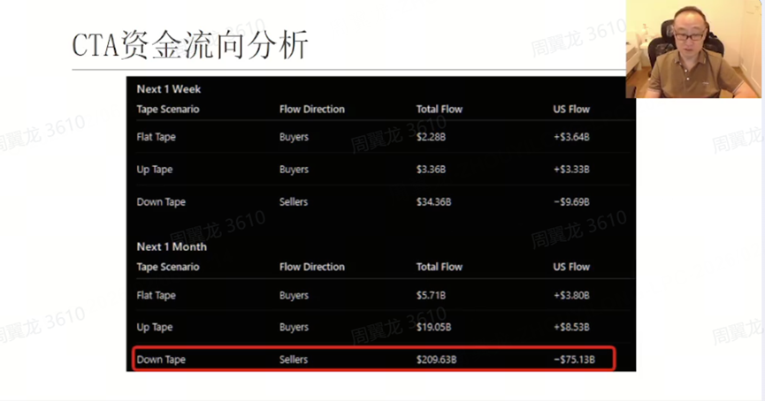 On the behavior of capital flows, he referenced a CTA (Commodity Trading Advisor) fund flow model: during rallies or sideways markets, inflows are relatively modest, but in a downtrend, outflows amplify significantly. He stated, “This also makes downside moves more favorable—the path of least resistance is clearly downward.”