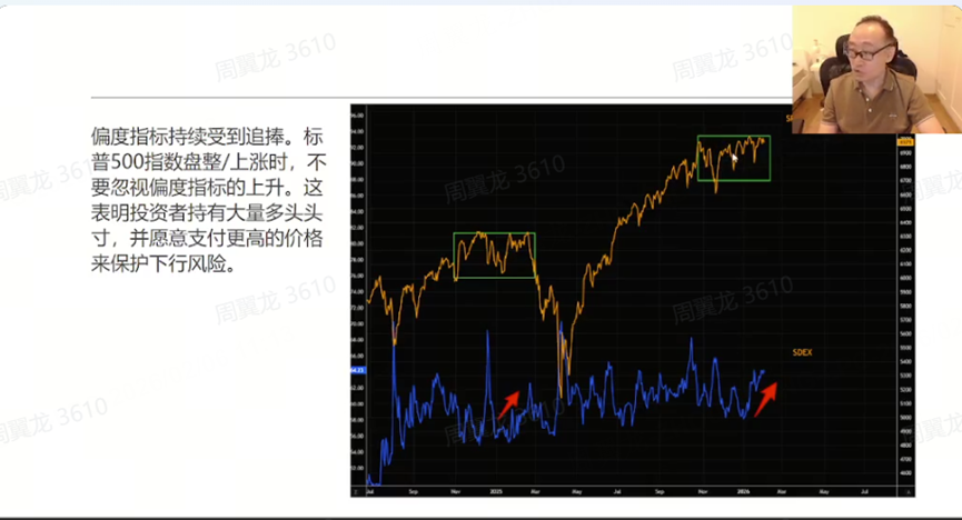 The options market is also signaling risk: he pointed out that “skew is rising,” which means “investors are buying puts even as they go long U.S. equities”—a sign of growing hedging demand.