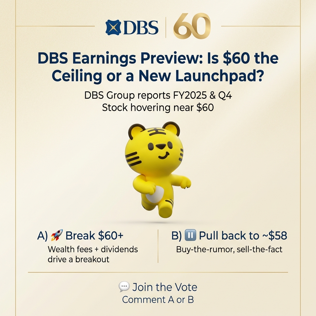 The "Alpha" of Singapore banking, $DBS(D05.SI)$, is set to release its full-year 2025 and Q4 results on Monday, Feb 9. With the stock currently hovering near the $60 psychological barrier after a massive 2025 rally, all eyes are on whether this report will provide the momentum for a breakout.