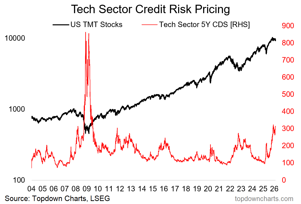 another intriguing datapoint has been the surge in credit risk pricing for the tech sector. It was all fun and games with AI hype when it was just equity markets, but now that credit markets are involved it doesn't seem so fun anymore…