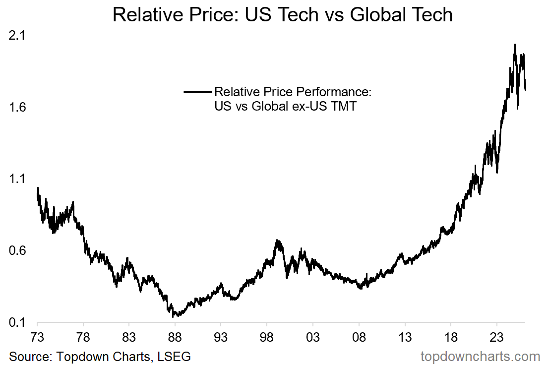 all of this (weakening technicals, bearish sentiment signals) is set against a backdrop of expensive valuations. US Tech stocks have been bid up to extremely expensive levels vs history, vs non-tech, and vs global tech.