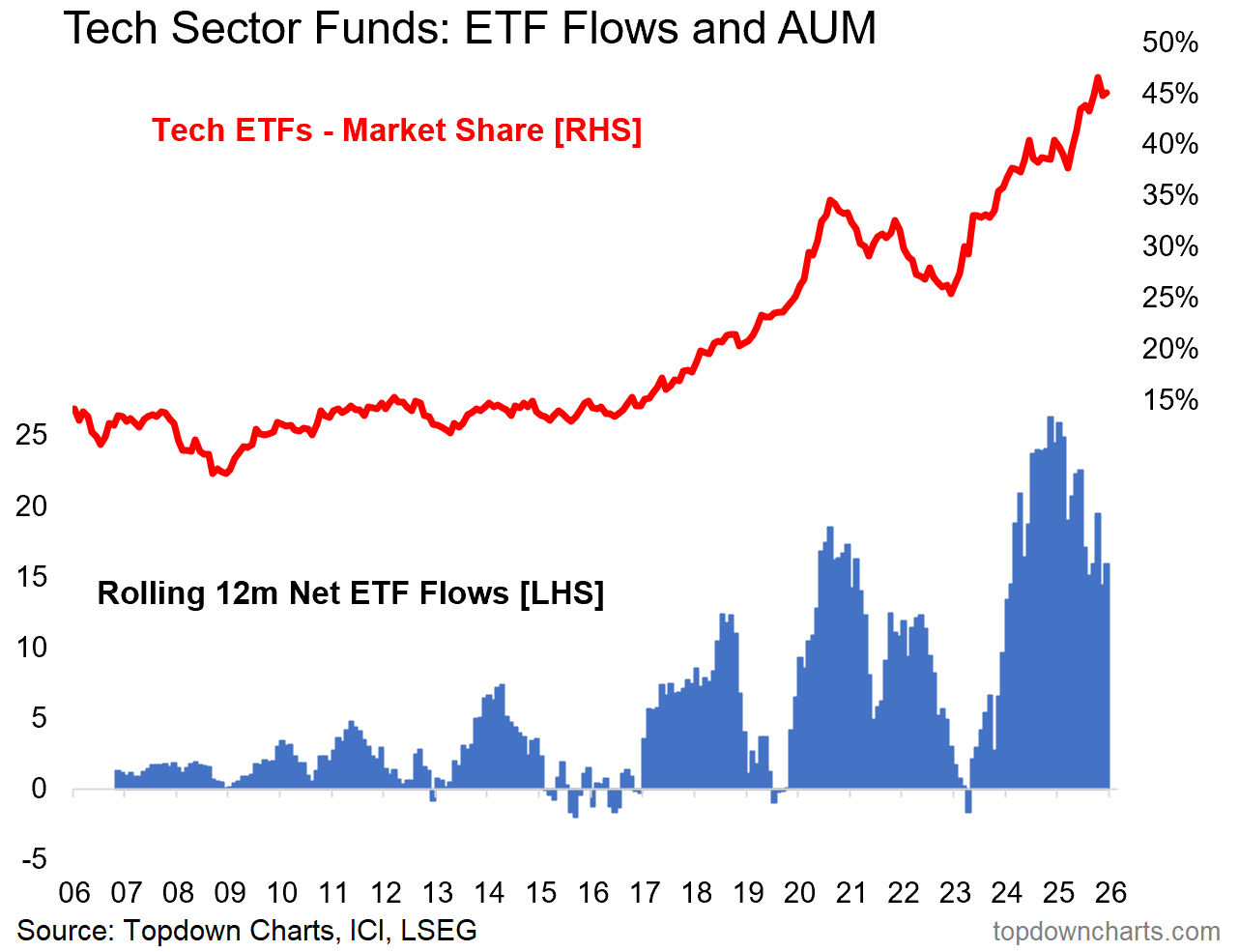 similarly, tech sector implied investor allocations have peaked after reaching a record high (not far off 50%(!)), and rolling annual net flows to tech actually peaked at the end of 2024. So it’s a picture of former extreme-bullish sentiment peaking and rolling over (a classic bearish technical signal).