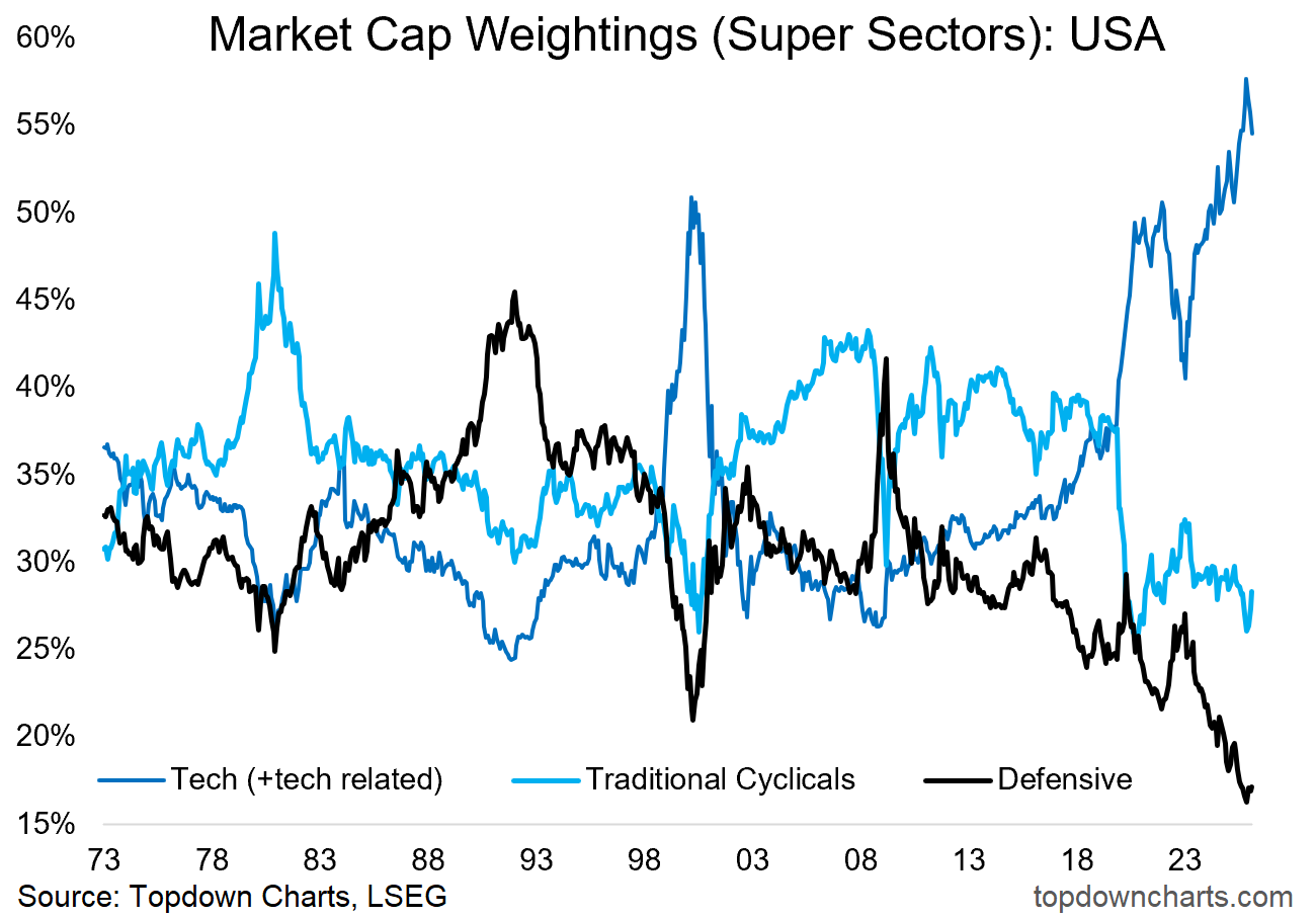 this chart basically lays out the best and worst case for what happens after the peak in tech. It shows tech stocks’ market cap weight rolling over from record highs, cyclicals’ weight ticking up off the lower end of the range, and defensives’ up from record lows. And therein lie the clues for the two key scenarios of how the tech-top might unfold from here: