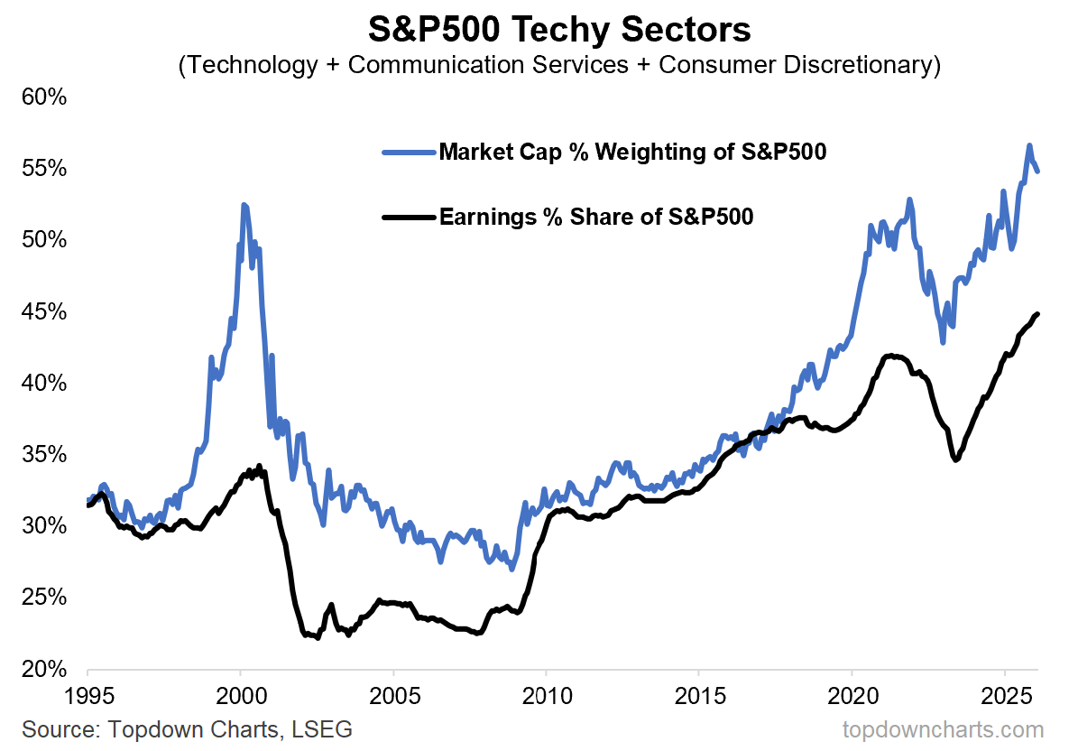for instance, bulls can definitely point to the exceptional profitability of US tech stocks, as illustrated in the chart below (+strong trend in trailing earnings + expectations of continued strong uninterrupted earnings growth into the future).
