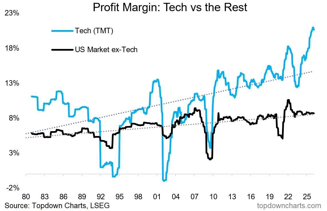 But this also presents a vulnerability. If extremely high tech stock valuations reflect strong profitability, what if profit margins peak and rollover from cyclically extended levels? And if expensive valuations reflect the expectation of strong uninterrupted future earnings growth, what if earnings plateau? or even worse, what if earnings were to decline?