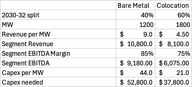 I am using an 85% segment EBITDA margin for bare metal and 75% for colocation.