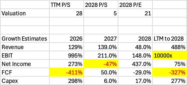 This means that Iren is trading for the FY 2028 P/S of 5 and P/E of 21!