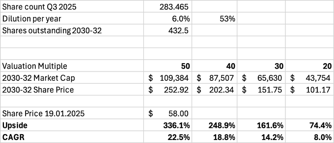 The multiple depends on the state of the AI market in 2030-32 and Iren’s expansion potential. If the AI data center market has reached maturity, the market could assign a multiple even lower than 20. Iren runs a very capital-intensive business, with yet unproven economics. If profitability is lower than I model, then returns could be more modest.