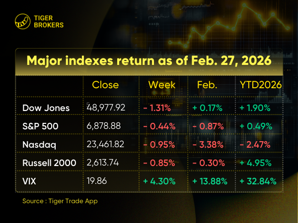 No clear direction: the $Dow Jones(.DJI)$ finished down 1.31% for the week, the $NASDAQ(.IXIC)$ declined 0.95%, and the $S&P 500(.SPX)$ slipped 0.44%.