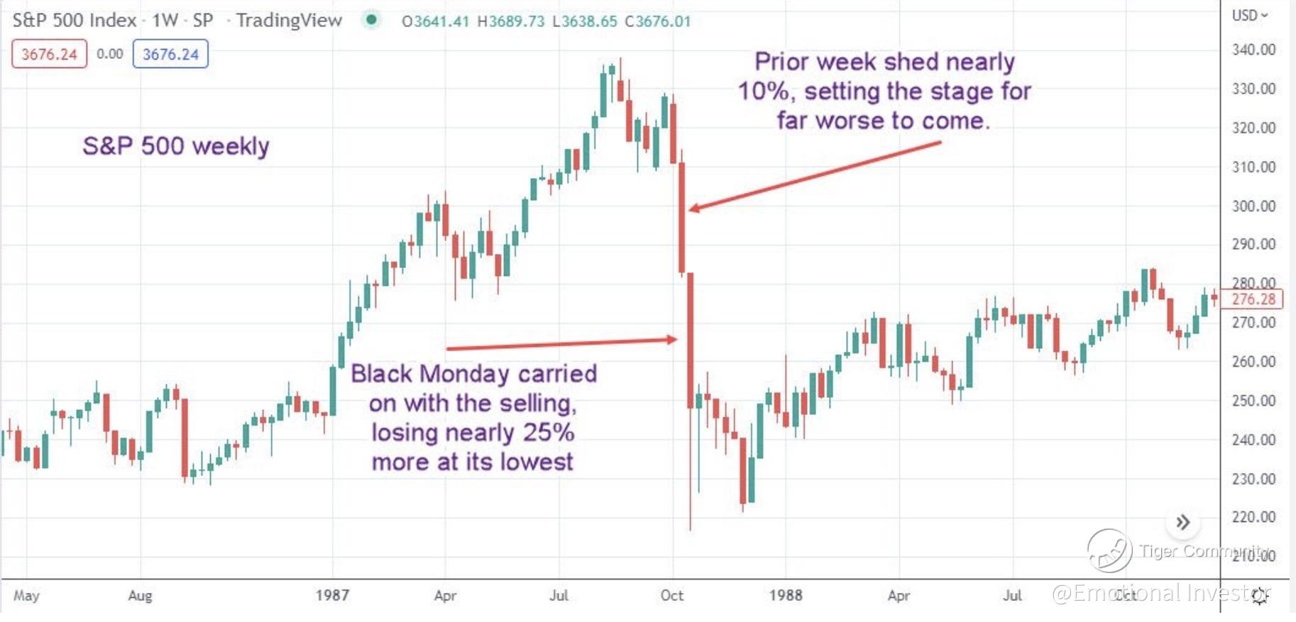 In around august of 1987, the market peaked at all time highs, the s&p almost hit 340. the weeks that followed were a "normal" retraction, until on a Friday in October the s&p lost 10% in a day. Not just a few stocks, the entire market. Then the following Monday... black Monday, stocks across the board dropped a further 25% in a single day. The entire market lost a third of its value in 2 trading days, down to 220.
