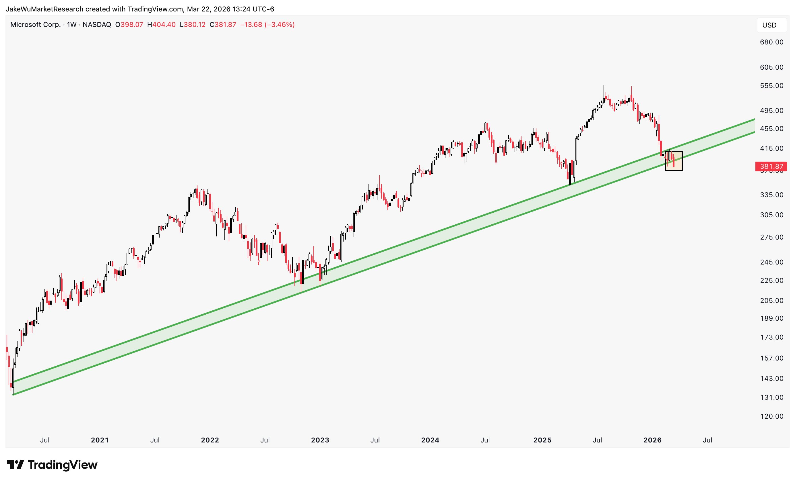 $Microsoft(MSFT)$The weekly candle closed below the bottom of this diagonal trend zone last week.